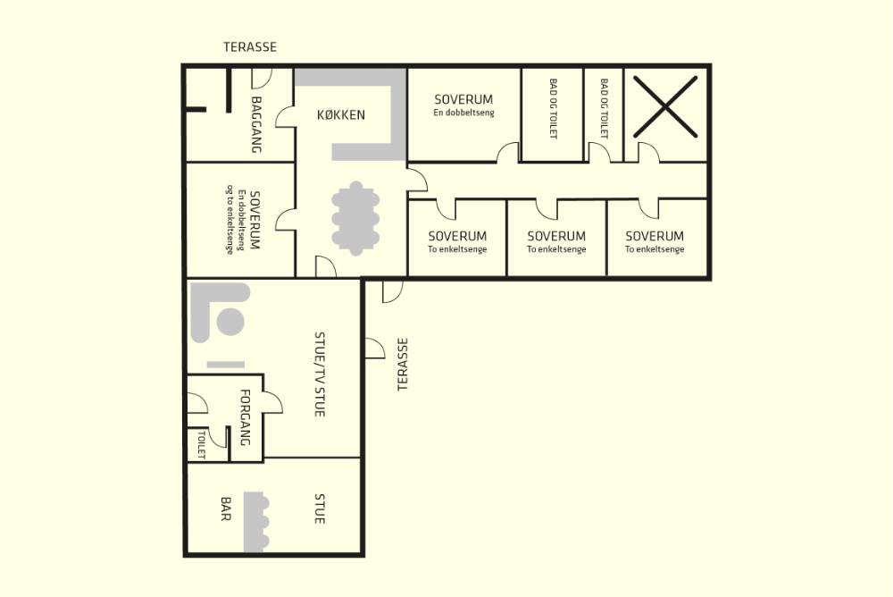 • 1 soveværelse med dobbeltseng og to enkeltsenge (køjeseng)