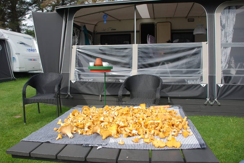 Her på pladsen er vi glade for naturens storslåede skatkammer og den dejlige mad, jorden, skovbunden og havet leverer. Fra juli til oktober er det ganske almindeligt at gå forbi campingvogne og telte med kurve fulde af friskplukkede svampe eller campister i gang med at rense og finbørste kantareller, de lige har fundet.